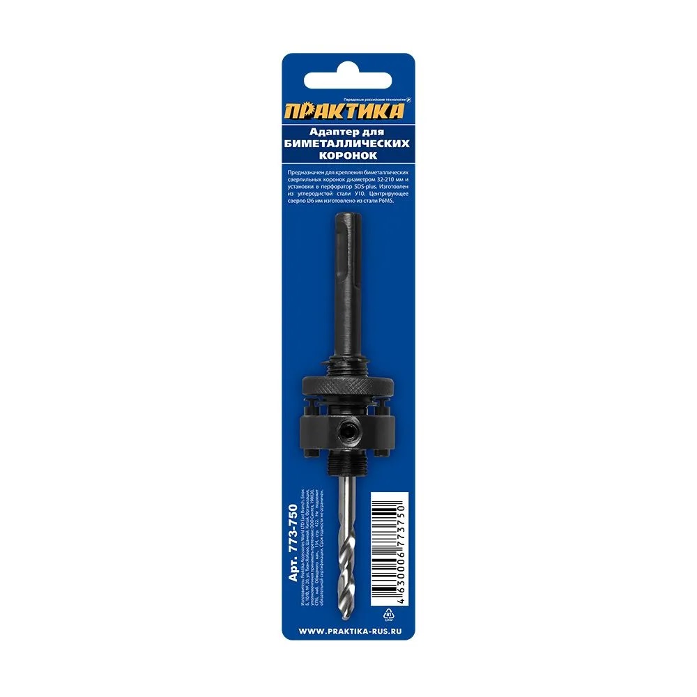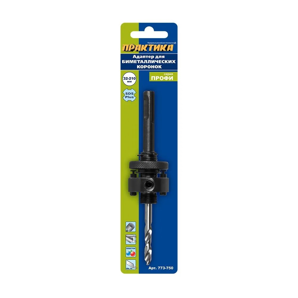 Адаптер ПРАКТИКА держатель со сверлом для BIM коронок ф32-210 мм, хвостовик SDS-plus Предназначен для крепления биметаллических сверлильных коронок и установки в сверлильный патрон перфоратора . Диаметры устанавливаемых коронок 32-210 мм. Хвостовик изготовлен их углеродистой стали У10. Центрующее свело 6 мм, изготовлено из быстрорежущей стали.