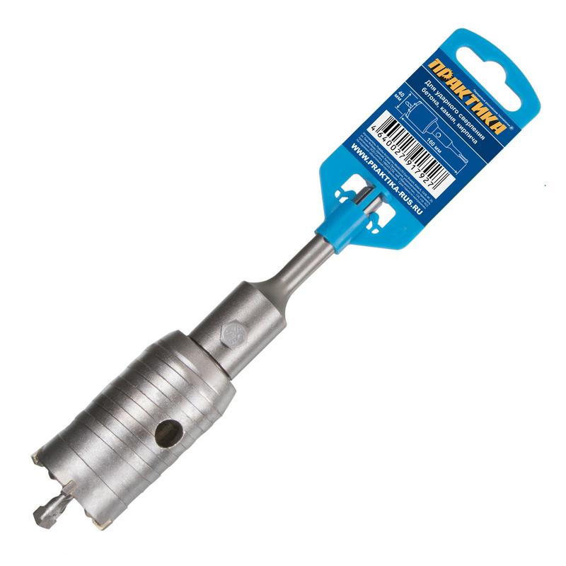 Коронка сверлильная по бетону ПРАКТИКА SDS- Plus ударная 40 мм (1шт.) Твердосплавная коронка SDS-Plus диаметром 40 мм (посадочный диаметр — М22) представлена российским брендом ПРАКТИКА. Она изготовлена из высококачественной стали на современном производстве и отвечает требованиям прочности и долговечности. Изделие разборное, состоит из восьми режущих элементов, расположенных на окружности, а также адаптера и центрирующего сверла. Модель предназначена для сухого бурения бетона, кирпича и прочих строительных материалов при прокладке сантехнических труб, прочих коммуникаций.