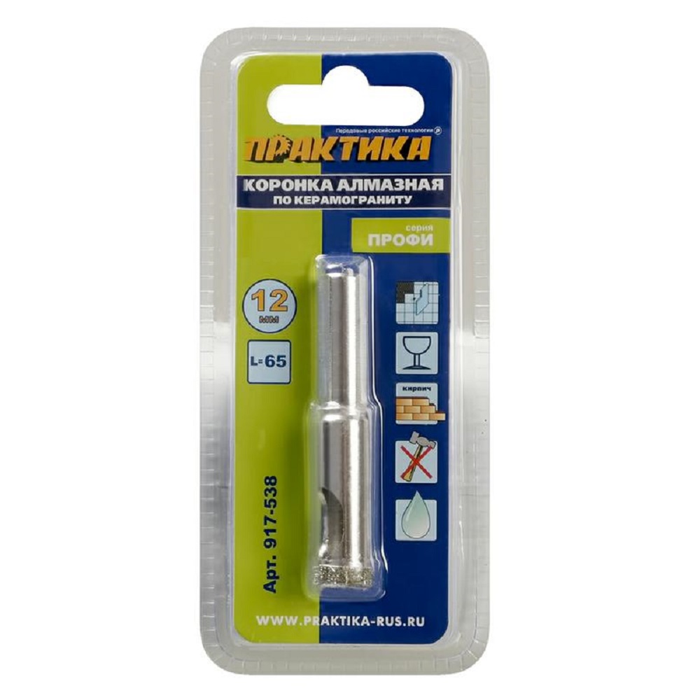 Коронка по керамограниту Практика 12х65мм алмазная 1шт блистер Профи