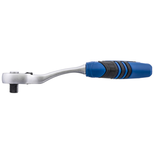 Трещоточная рукоятка изогнутая 145 мм КОБАЛЬТ 244-087 предназначена для завинчивания/отвинчивания резьбового крепежа с помощью головок с приводным квадратом 1/4". Механическая часть изготовлена из хромванадиевой стали, имеет надежный храповой механизм 72 зуба, собачки которого имеют 3 ступени зацепления с храповиком. Наиболее хорошо подходит для работы в узких местах, позволяет минимизировать угол поворота до 5о. Эргономичная двухкомпонентная (резина/пластик) рукоятка повышает комфортность работы. Изогнутая форма рукояти позволяет комфортно работать в стесненных условиях, что особенно важно при использовании в автосервисах во время ремонта различных механизмов и агрегатов, доступ к которым затруднен. Удобная кнопка фиксации головки и флажковый переключатель направления вращения повышают скорость работы. Рекомендована для головок с размерами 4-14мм. Ремонтопригодна, ремкомплект храповика - Арт. 642-456, обслуживание производится с помощью отвертки Torx-8. Запрещается использовать для непосредственного затягивания или отворачивания сильно затянутого крепежа, для затягивания или страгивания необходимо использовать вороток.