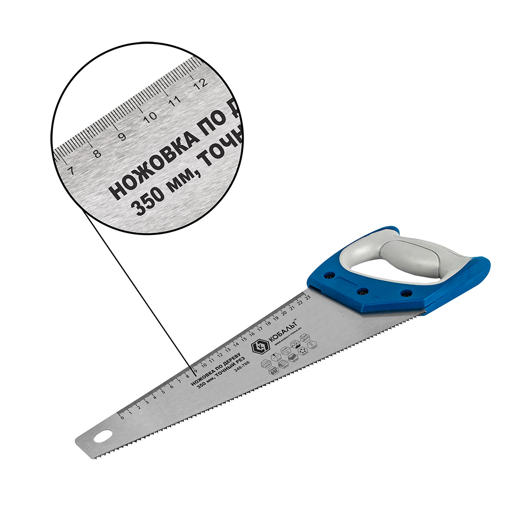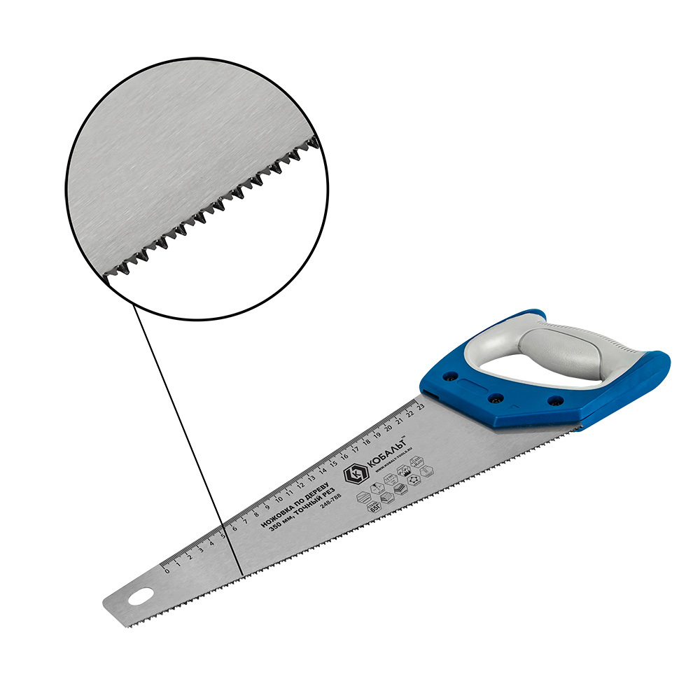 Ножовка по дереву Кобальт 350 мм шаг 2 мм/ 12 TPI, закаленный зуб, 3D-заточка, двухкомпонентная рукоятка, точный рез