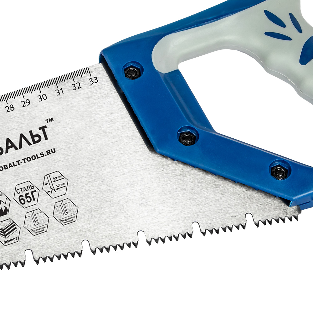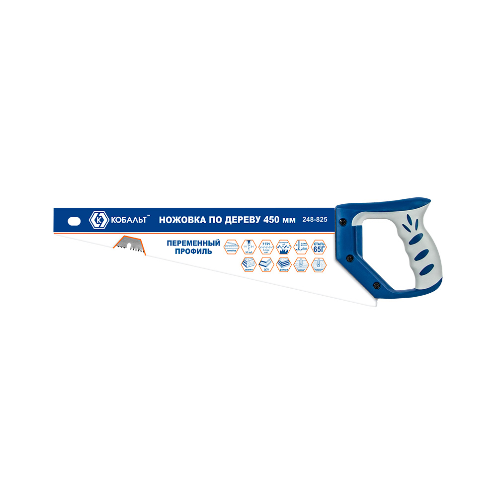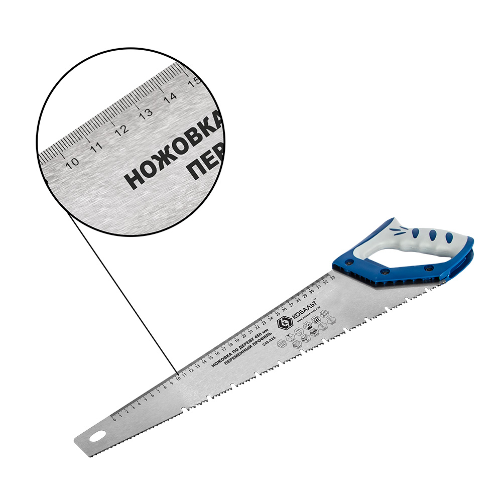 Ножовка по дереву 450мм КОБАЛЬТ предназначена для прямолинейного пиления мягкой и твердой древесины, фанеры. Изготовлена из углеродистой инструментальной стали 65Г. Двухкомпонентная рукоятка не проскальзывает в руках во время работы. Поверхностная закалка режущей кромки зуба способствует сохранению заточки длительное время. 3D-заточка позволяет более эффективно разрезать материал. Переменный профиль зуба идеально подходит для работы с сырой древесиной, пиления вдоль и поперёк волокон. Длина рабочая 450 мм, шаг зубов 3,5 мм 7 зубьев на 1 дюйм (7 TPI)
