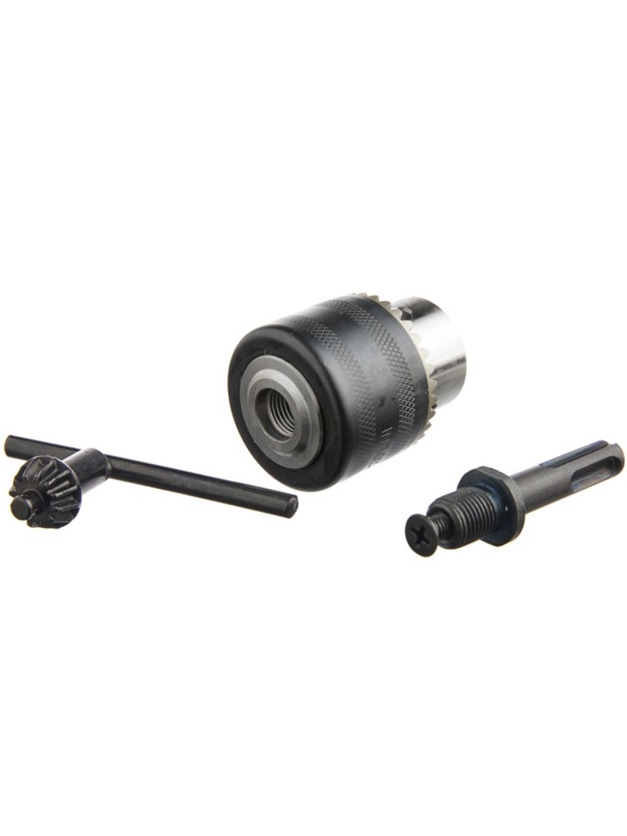 Надежная фиксация сверла в патроне исключает проворачивание. Трехкулачковый патрон с наклонно расположенными кулачками. Для закрепления сверл, а также разверток, зенкеров и зенковок, отвёрточных насадок. Затяжка происходит при помощи идущего в комплекте ключа.