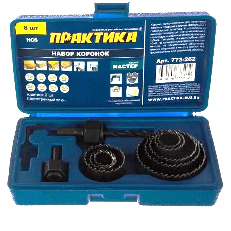 Набор HCS коронок ПРАКТИКА 773-262 состоит из 8 предметов и 2 адаптеров. Упакован набор в пластиковый бокс, который подходит как для хранения, так и для транспортировки. Наборы коронок из высокоуглеродистой стали для сверления сквозных отверстий в дереве, ДСП, гипсокартоне. Применяются при установке мебельных светильников, электроустановочных изделий, протяжке проводов, водопроводных труб, установке замков в деревянные двери. Для сверления стали не подходят, необходимо использовать биметаллические коронки. При сверлении зубчатыми коронками ламинированных ДСП часто происходят случаи откалывания задней поверхности листа ДСП, либо образуются значительные сколы на кромке. Чтобы этого избежать, необходимо сначала просверлить отверстие направляющим сверлом, затем установив коронку, просверлить лист до середины с лицевой стороны, после высверлить остающуюся часть с обратной стороны. При сверлении отверстий большого диаметра необходимо применять низкооборотистую дрель с высоким крутящим моментом, или аккумуляторный шуруповерт. Обычные бытовые дрели с высокими максимальными оборотами (2800-3000 об/мин) целесообразно использовать только при сверлении мягких материалов: дерево, ДСП, гипсокартон, пластик.
