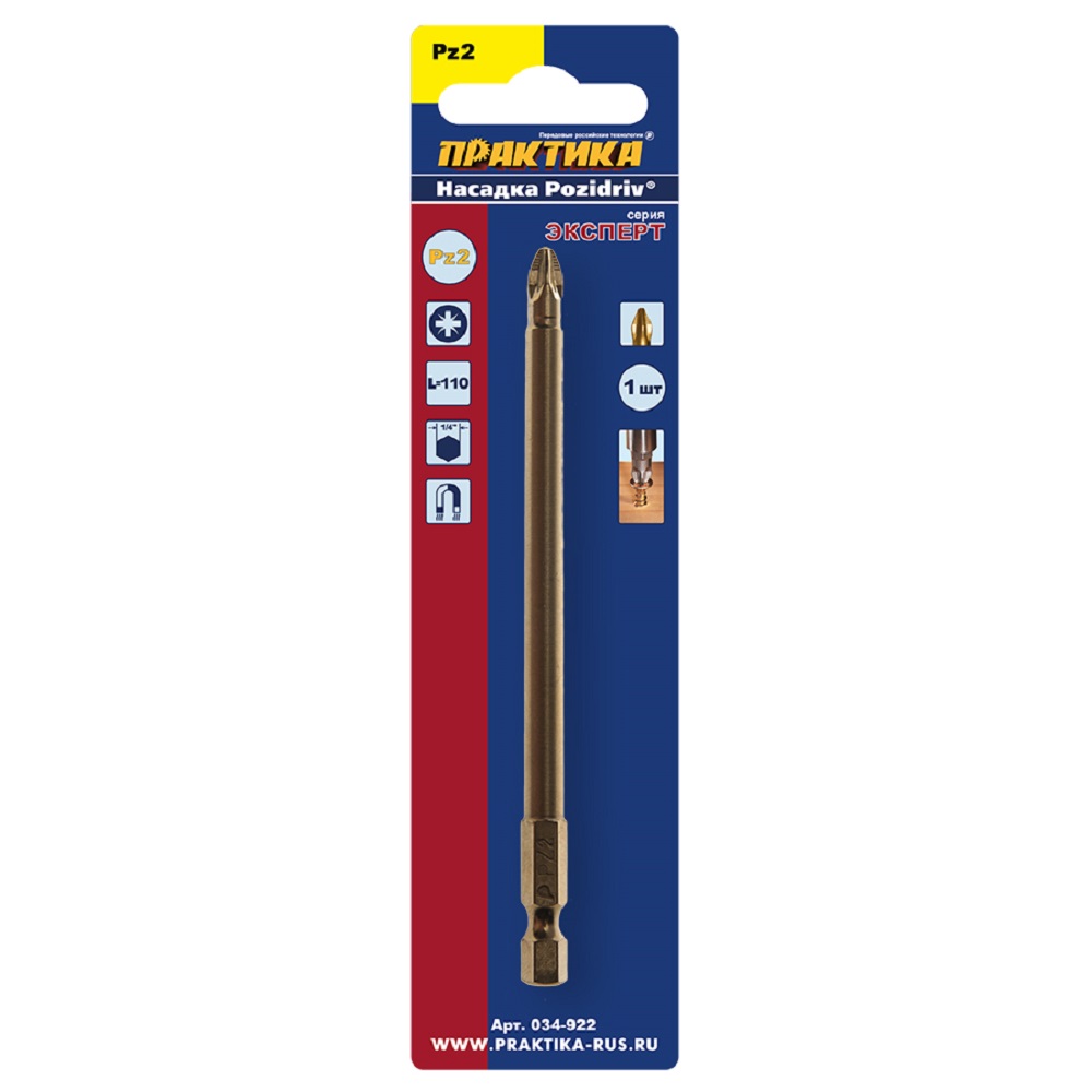 Бита отверточная ПРАКТИКА "Эксперт" PZ-2 х 110мм Tin (1шт), блистер. Насадки отверточные Pozidriv. Магнитные. Серия "Эксперт". Отверточные насадки ПРАКТИКА серии «Эксперт» идеально подходят для профессионального применения. Улучшенная геометрия позволяет наиболее четко фиксировать насадку в шлице самореза, сводя до минимума вероятность срыва, что существенно увеличивает ресурс насадки и не повреждает шлицы и поверхность материала. Дополнительно для улучшения сцепления со шлицом при закручивании длинных саморезов на рабочую часть насадки нанесены специальные насечки (ACR) увеличивающие поверхность сцепления. Специальная хромванадиймолибденовая сталь (CrVMo) и температурная обработка токами высокой частоты (ТВЧ) обеспечивают наибольшую поверхностную твердость 60-61 HRC в сочетании с достаточной вязкостью острия насадки, что полностью исключает, как единовременное сворачивание насадки, так и ее излом. Покрытие нитридом титана (TiN) обеспечивает дополнительное упрочнение поверхности рабочей части насадки. Магнитные свойства позволяют удерживать саморез в любом удобном положении.