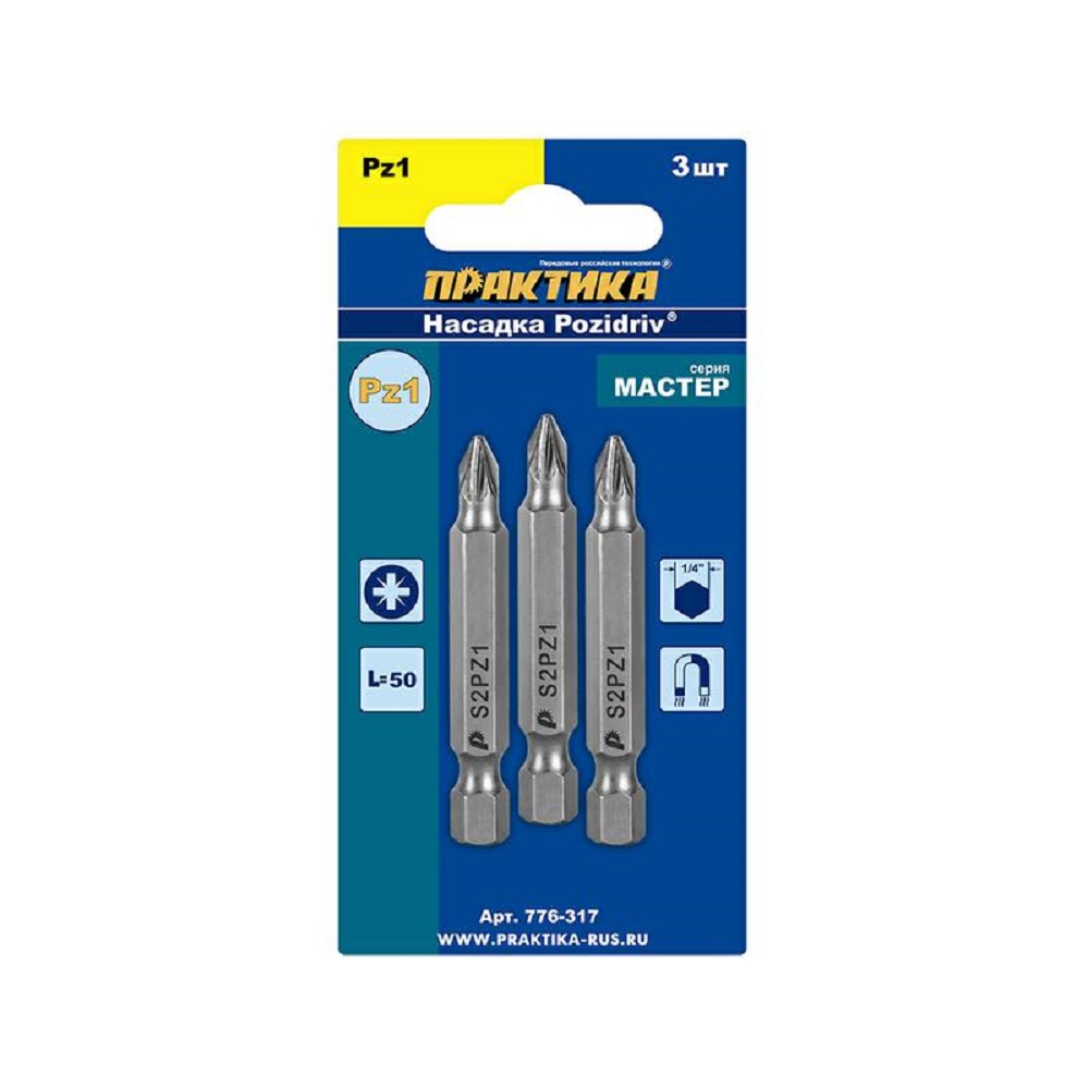 Бита отверточная ПРАКТИКА "Мастер" PZ-1 х 50мм (3шт), блистер. Отверточные насадки ПРАКТИКА серии «Мастер» при невысокой стоимости обладают хорошими рабочими характеристиками для большинства работ где не требуется высокая интенсивность. Имеют простую шестигранную форму. Изготовлены из легированной инструментальной стали S2 твердостью 56-57 HRC. Магнитные свойства позволяют удерживать саморез в любом удобном положении.