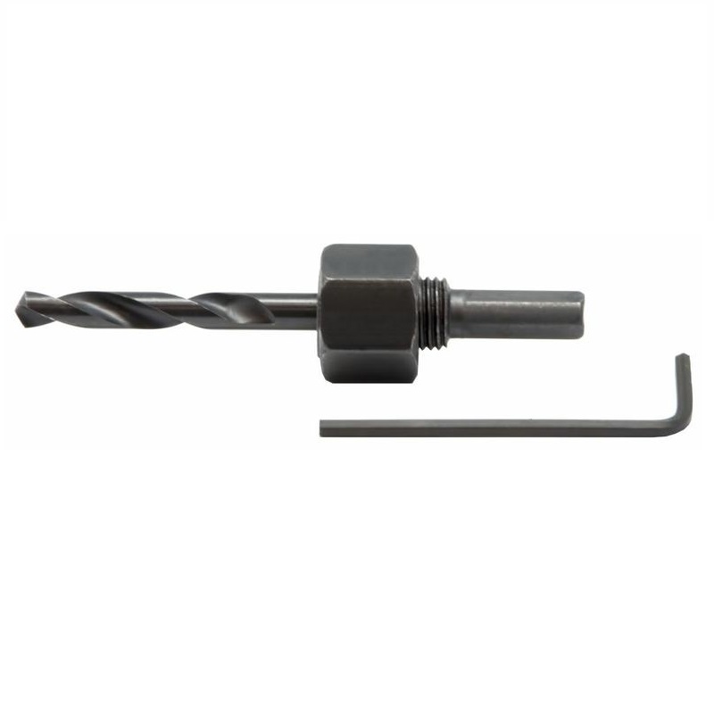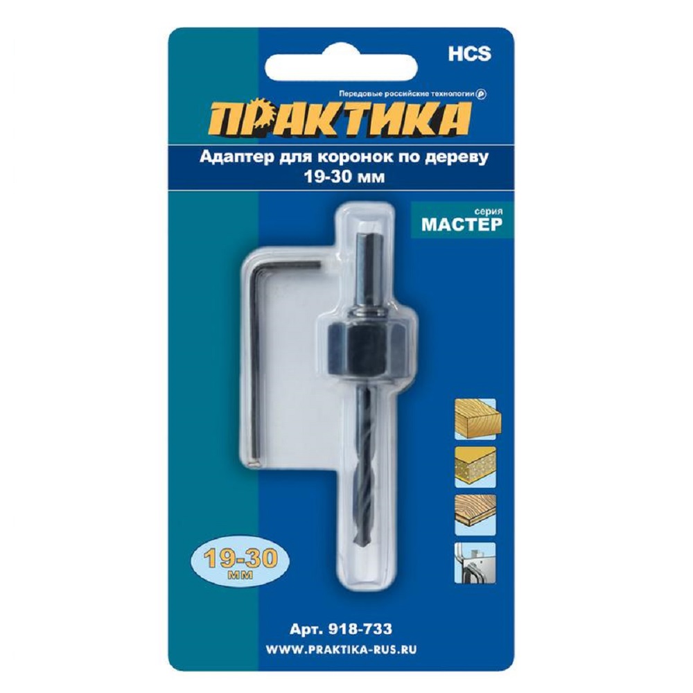 Адаптер ПРАКТИКА держатель для HCS коронок 19-30 мм Предназначен для крепления сверлильных коронок по дереву и установки в сверлильный патрон дрели или сверлильного станка. Изготовлен из углеродистой стали У10. Состав: хвостовик с упорным винтом и контргайкой - ведущая пластина - центрирующее сверло 6 мм - шестигранный ключ При сверлении коронками большого диаметра, чтобы не повредить посадочное отверстие, необходимо установить на адаптер ведущую пластину для передачи крутящего момента на коронку.