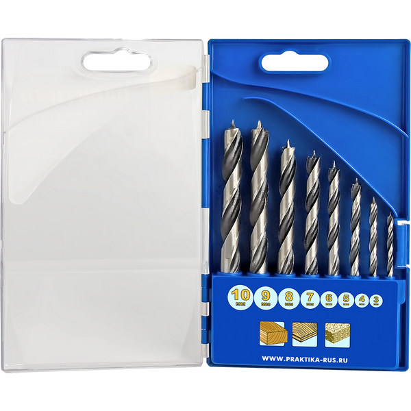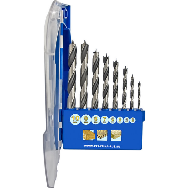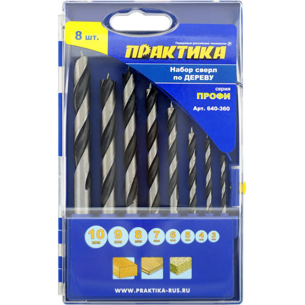 Набор сверл по дереву Практика 640-360 серия Профи в удобной упаковке. В комплекте 8 сверл: 3 мм, 4 мм, 5 мм, 6 мм, 7 мм, 8 мм, 9 мм, 10 мм. Предназначены для сверления глухих и сквозных отверстий дереве, фанере, ДСП, OSB, гипсокартоне.