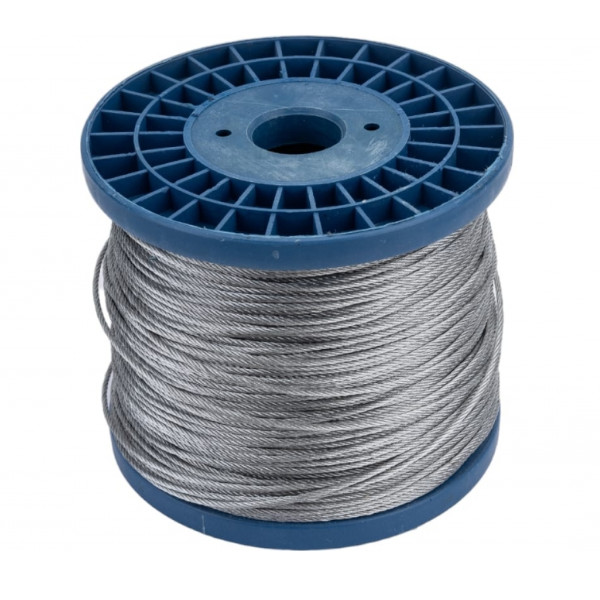Материал для изготовления витого троса средней мягкости – оцинкованная проволока. Ее в намотанном на катушку виде используют в станке для навивки троса. Это изделие производится методом кручения по схеме 6*7, когда 6-ть прядей обвиты вокруг органического сердечника. Такая деталь это опора прядей, снижающая действующие радиальные нагрузки. Прядь, в свою очередь, состоит из шести проволок, навиваемых на седьмой. Диаметр троса 1мм Диаметр троса в оплетке 2мм