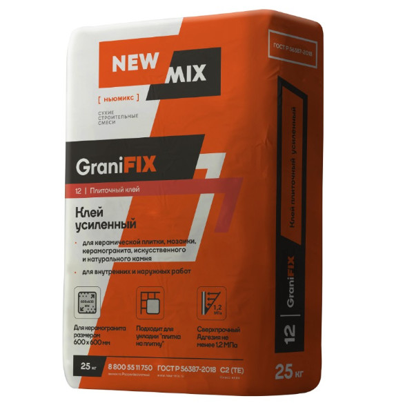 Плиточный клей усиленный GraniFIX Для керамической плитки, мозаики, керамогранита, искусственного и натурального камня; Для внутренних и наружных работ При наличии отметки "ЗИМА" на боковой части упаковки продукт можем использоваться при температуре до -10 °C ГОСТ Р 56387-2018 Класс клея С2 (ТE) Все виды кирпича и блоков из ячеистого и облегченного бетона; Цементные штукатурки, стяжки, наливные полы; Стены из ГКЛ, ГВЛ, ЦСП; "Теплый пол" любого типа.