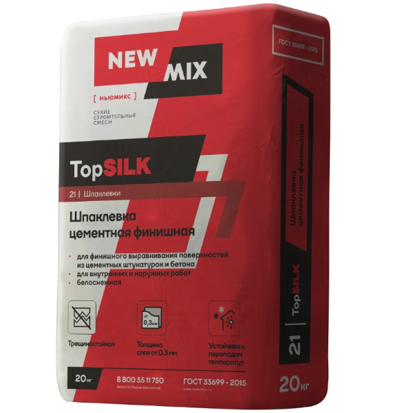 Шпаклёвка цементная финишная белая TopSILK весом 20 кг — сухая строительная смесь на основе цементного вяжущего, минерального заполнителя и специальных функциональных добавок. Назначение: финишное выравнивание стен и потолков внутри помещений с любым уровнем влажности и наружных работ по фасаду зданий. После отверждения материала образуется идеально гладкий и прочный слой, который пригоден для последующей окраски и оклеивания обоями.
