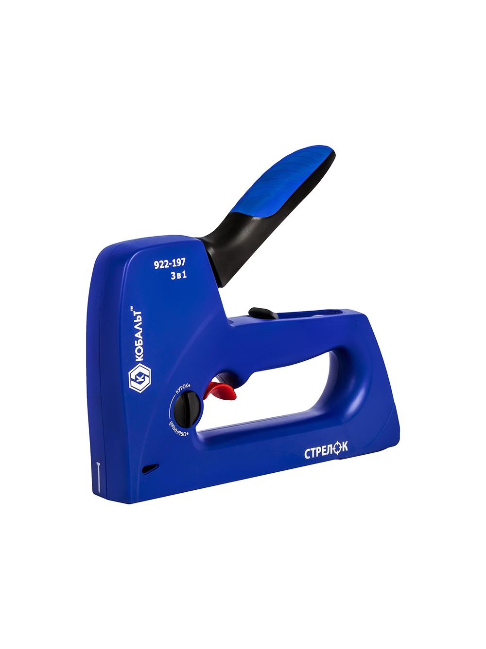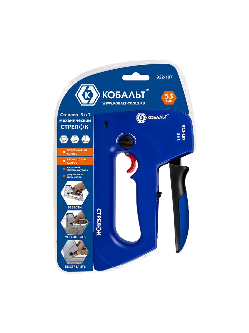 Степлер Кобальт СТРЕЛОК скобы 6-14мм тип 53,шпильки,гвозди,регулят удара,пласт.корпус, спуск крючок