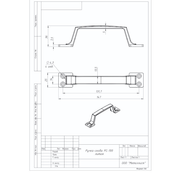 Ручка-скоба РС100 (цвет медь) изготовлена в соответствии с ГОСТ 5087-80 из алюминиевого сплава. Имеет 4 крепёжных отверстия для надёжного крепления к двери.