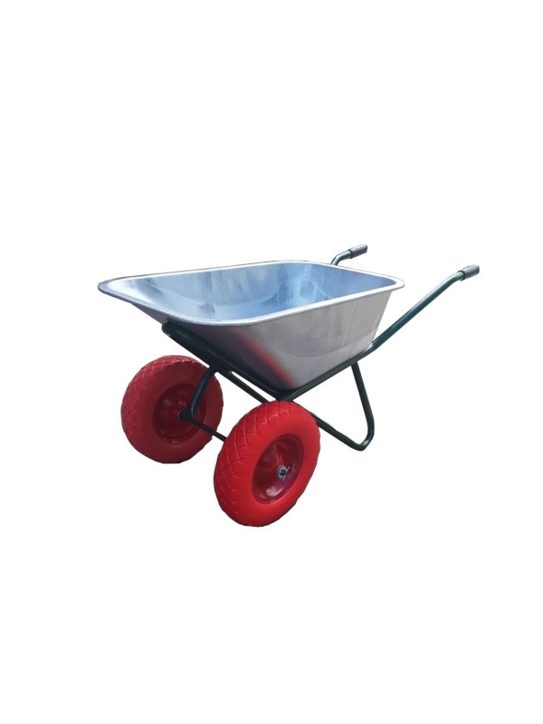 Тачка с оцинкованным кузовом, подходит для перевозки строительных грузов и сельскохозяйственных работ. Кузов изготовлен из оцинкованного металла, а рама — из металлической трубы.