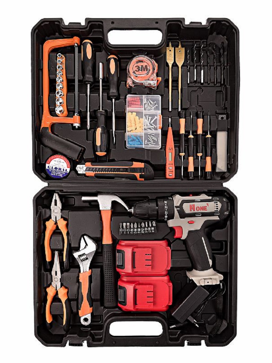• Комплектация — Набор свёрл, сверла по дереву, набор инструментов, рулетка 3м, саморезы с соразмерными дюбелями
